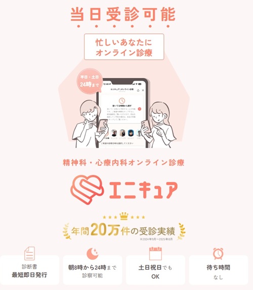 エニキュアは、全国対応の心療内科・精神科のオンライン診療サービスです。平日・土日ともに朝8時から24時まで診療に対応しており、早朝や夜間に受診したい方や、多忙な方にも利用しやすいのが特徴です。